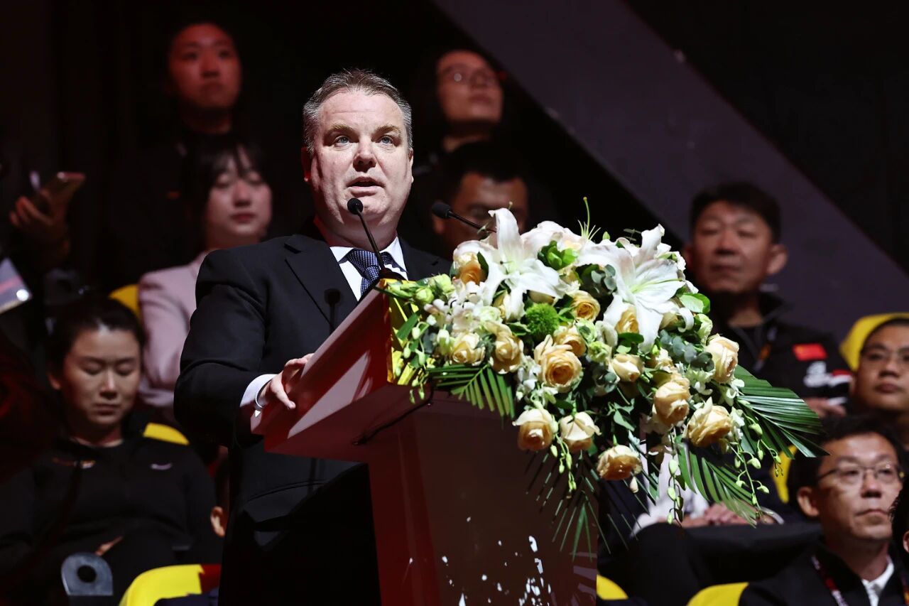 北京市石景山区委副书记、区长万隆首先进行欢迎致辞,他提到:“今年是WTT中国大满贯第二年,我们再次相聚在首钢园这片承载着工业记忆与时代活力的热土。正赛与青少年大满贯‘同址同期’举办,老将的沉稳与新星的锐气碰撞出别样火花。大满贯公园焕新升级,我们以首钢园为中心,串联起法海寺壁画博物馆的文化底蕴、石景山游乐园的烟火气息、六工汇商圈的时尚活力,把‘赛事记忆’刻进城市画卷。”