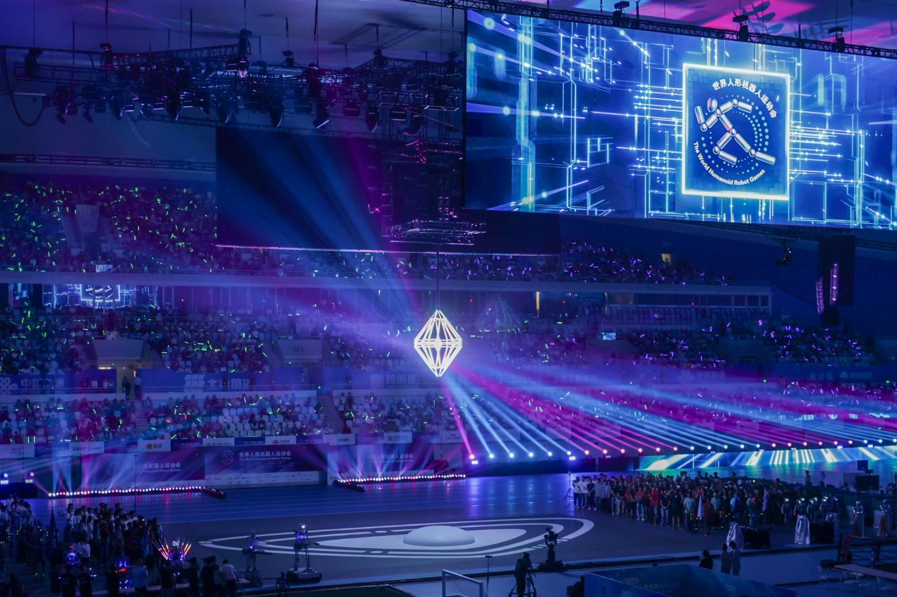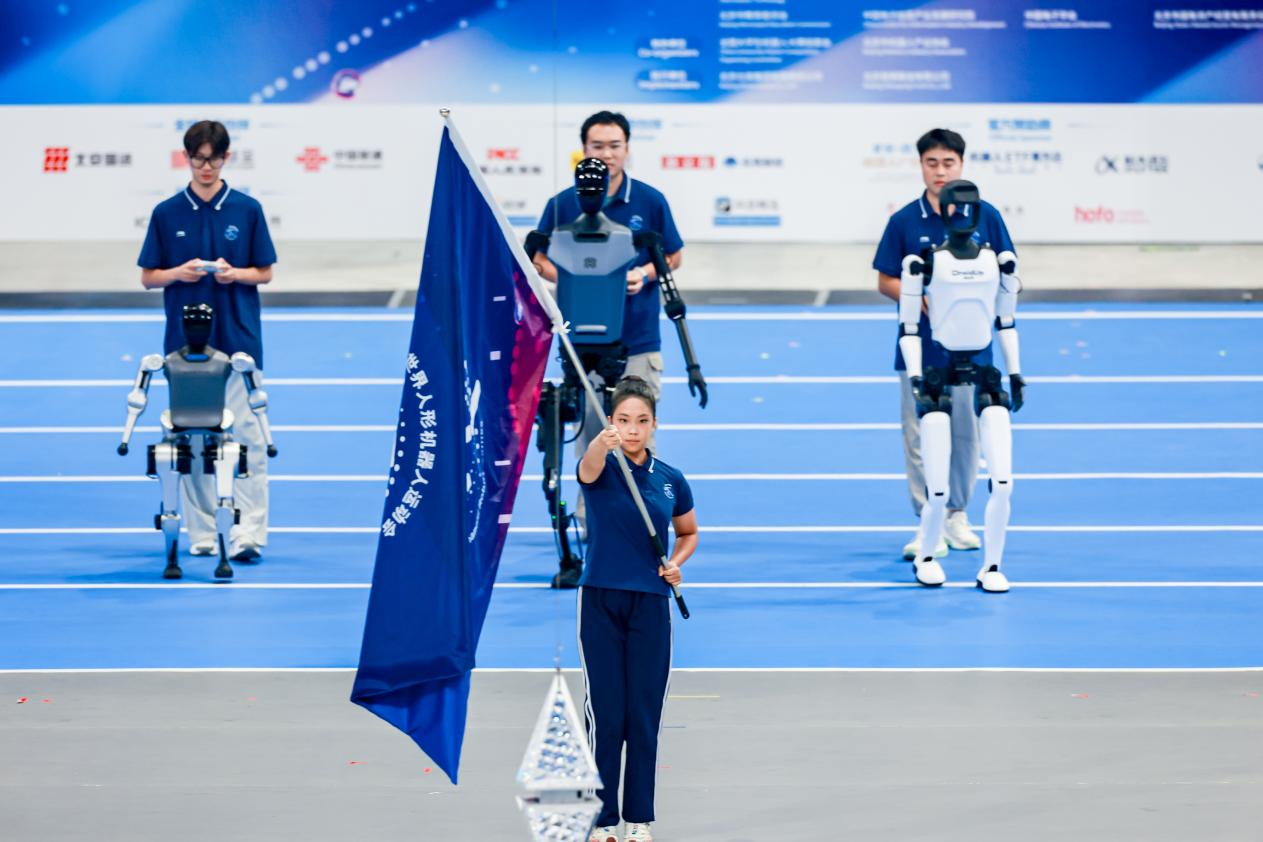 全场集结亮相和奏国歌之后,在赛前宣誓环节中,清华大学张继东作为裁判员代表宣誓,天工2.0 pro机器人代表运动员宣誓,传递公平竞技的体育精神。随着“能量传递VCR”播放,舞台中央的“智芯”装置——镶嵌蓝色晶体芯片的金属四棱锥被点亮,象征科技与人文的共生,也宣告赛事正式启动。