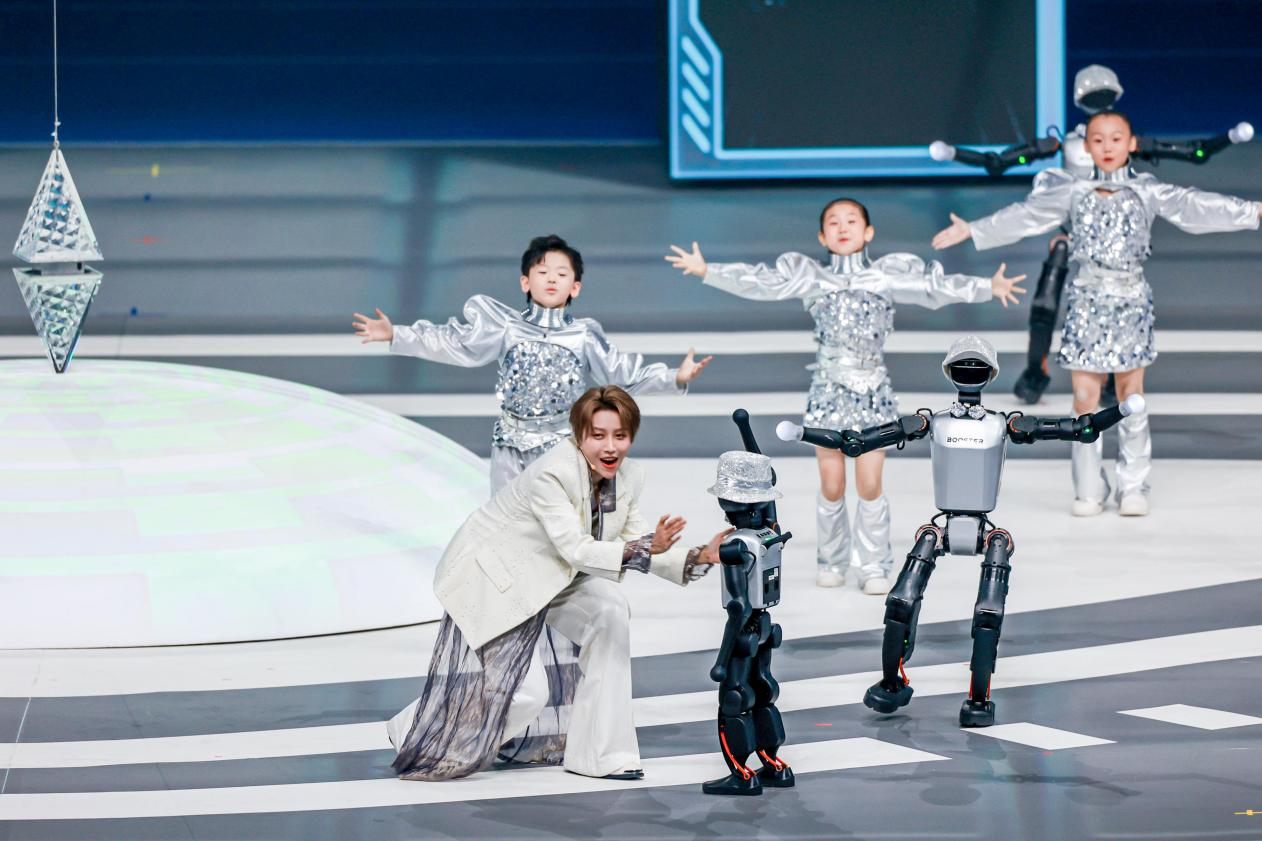 歌舞节目《欢迎来到碳基生命的世界》中,人类舞者与机器人以流畅协作演绎“碳基与硅基的对话”;传统文化创演《智韵和鸣》更成为亮点——磐石机器人乐队与灵心巧手机器人奏响国风旋律,乐聚机器人表演太极,优必选熊猫机器人与武术少年共展拳脚,“穆桂英”造型的戏曲机器人与小演员同台唱响《穆桂英挂帅》,尽显千年文脉与现代科技的“琴瑟和鸣”。